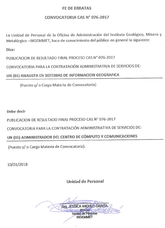| 07-2021 | Dirección de Derecho de Vigencia - DDV | CAS | UN/A (01) ASISTENTE ADMINISTRATIVO | | | | Cancelado |