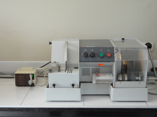 Desbastadora-cortadora Semiautomática: Este equipo tiene dos funciones realiza el corte de las galletas ( muestras) para secciones delgadas y a la vez realiza el desbaste de las laminas delgadas hasta un espesor de 100 micras.