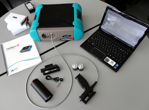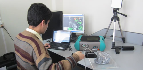 - Mediciones espectrales en campo y laboratorio : Mediante equipos de espectroradiometría que permiten llevar a cabo mediciones de las características espéctrales de las diferentes coberturas (minerales, roca, suelos, vegetación, agua, entre otros), los mismos que son usados ya sea para la calibración de los datos adquiridos mediante sensores satelitales o a bordo de aviones y validación de nuestros productos. De la misma manera pueden ser usados para llevar a cabo estudios de Reflectancia Aplicada al cartografiado de minerales en zonas con potencial minero como complemento en la caracterización espectral de depósitos/yacimientos minerales.